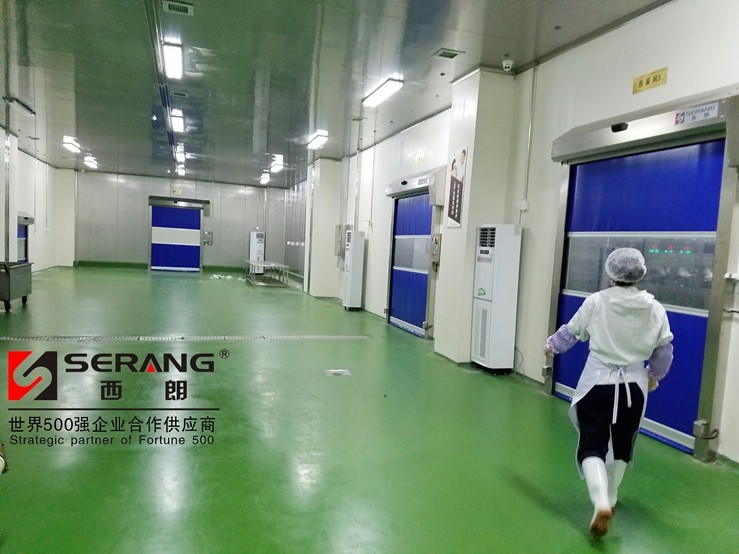 安徽合肥食品车间内部使用的SERANG西朗PVC快速卷帘门,实现各区域独立空间的洁净恒温,实拍图如下: